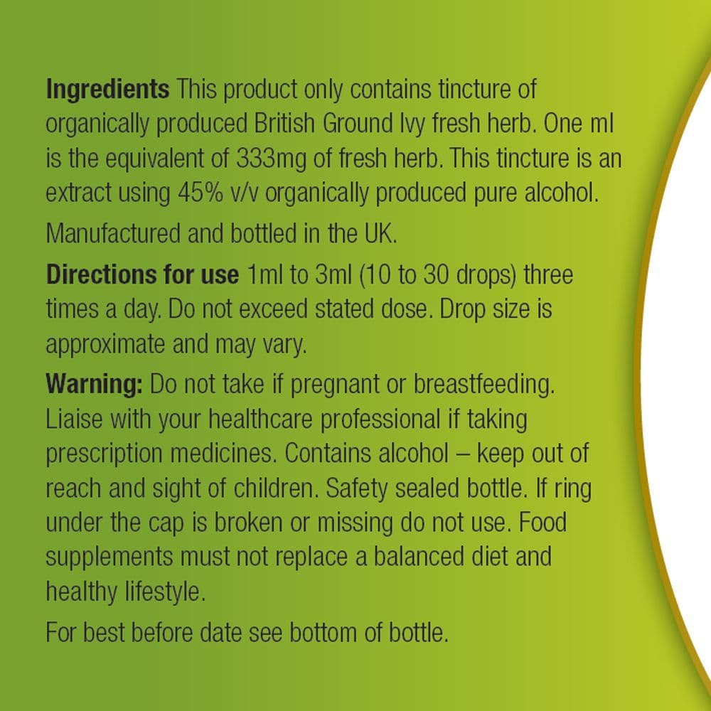 Our product contains only the finest quality tincture of organically produced Ground Ivy herb. The specification we use is the same as that required by many professional herbalists. The tincture strength is high with an equivalence of 1ml to 333mg of fresh herb. We use alcohol based tinctures as that is the most efficient method of extracting the synergistic benefits of the whole herb.